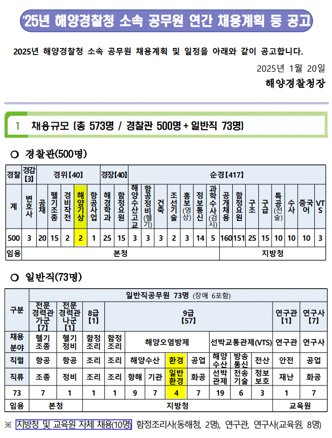 2025년 해양경찰청 공무원 연간채용계획 등 공고