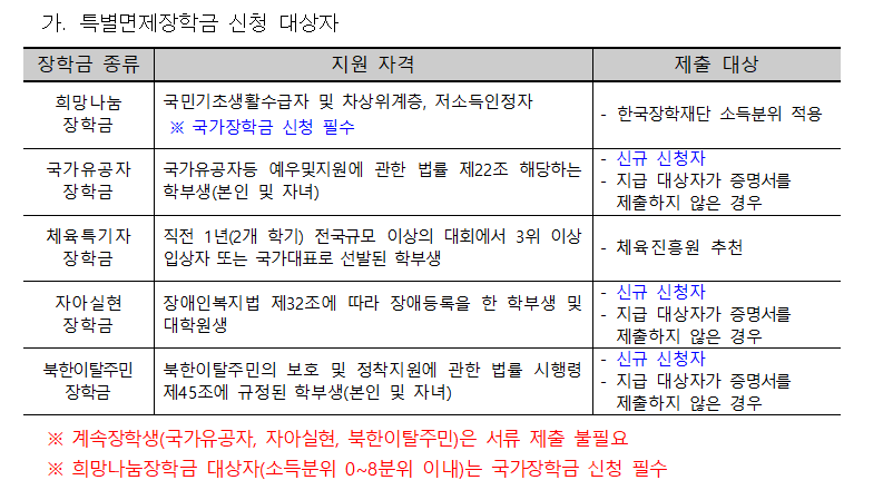 - 희망나눔장학금(기초생활수급권자 및 저소득층학생 대상)은 국가장학금 신청자 중 한국장학재단 소득분위에 따라 선발하며, 미신청자는 희망나눔장학금 수혜 불가