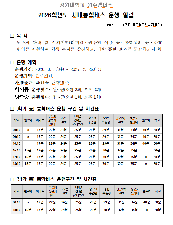 2026학년도 강원대학교 원주캠퍼스 시내 통학버스 운행 알림
