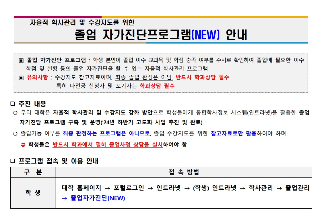 ★ 졸업을 최종 판정하는 프로그램이 아니므로, 학과별 교육과정 이수 학점을 참고하여 학점을 취득하시기 바랍니다.