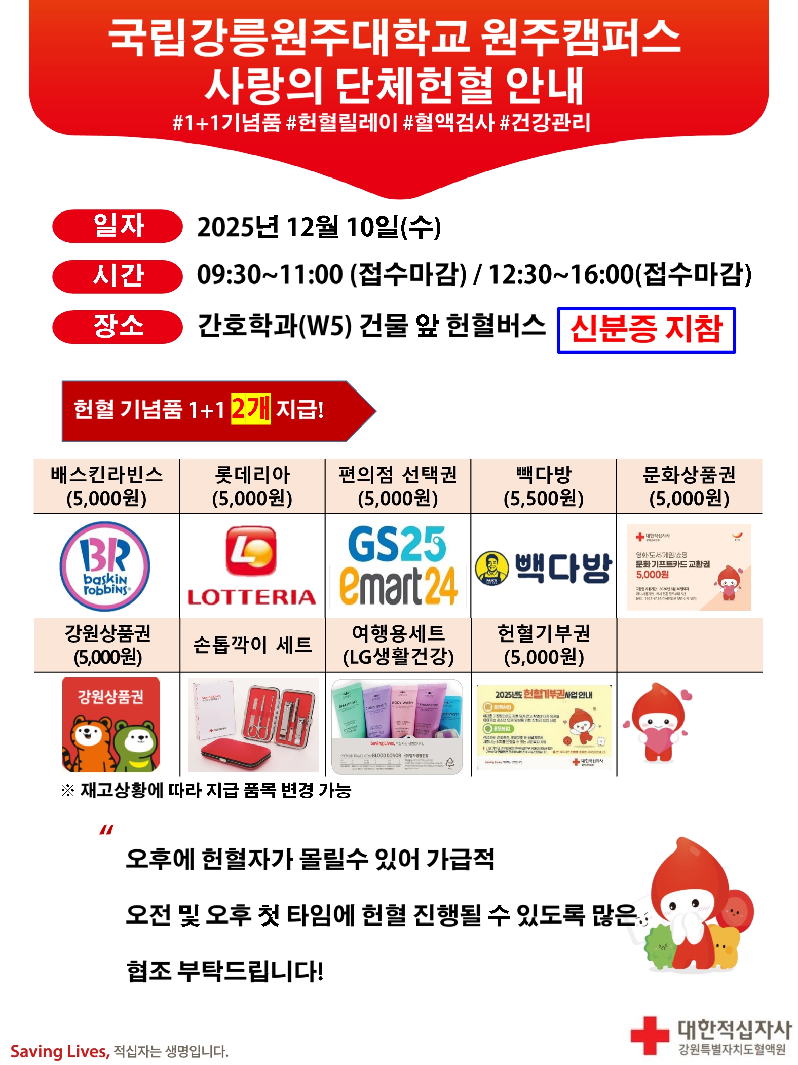 [보건실] 2025년 12월 원주캠퍼스 헌혈캠페인 실시 및 헌혈 우수자 포상금 지급