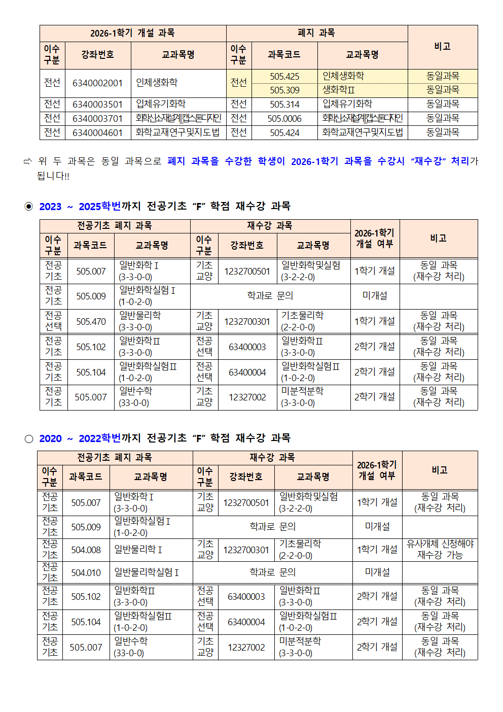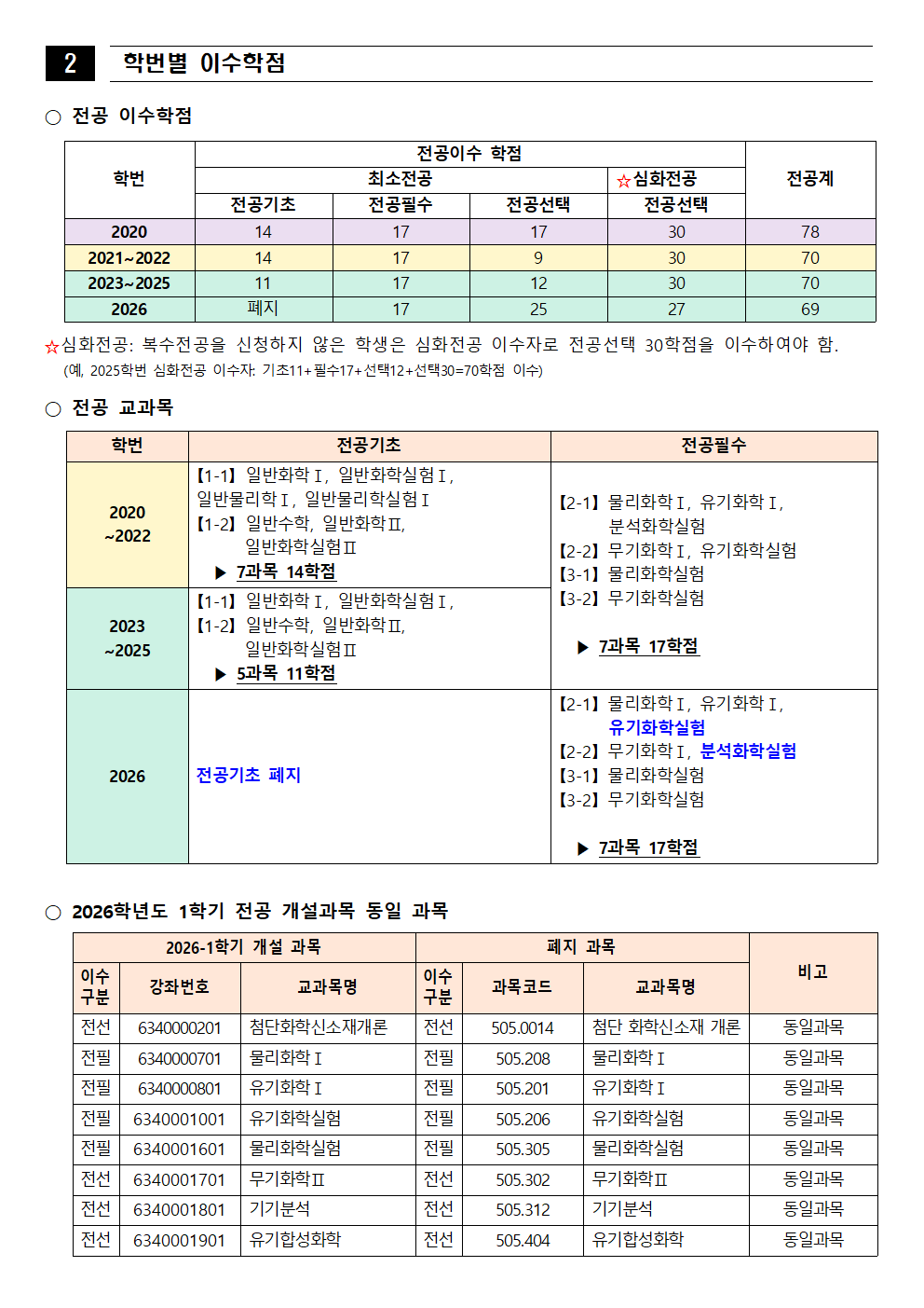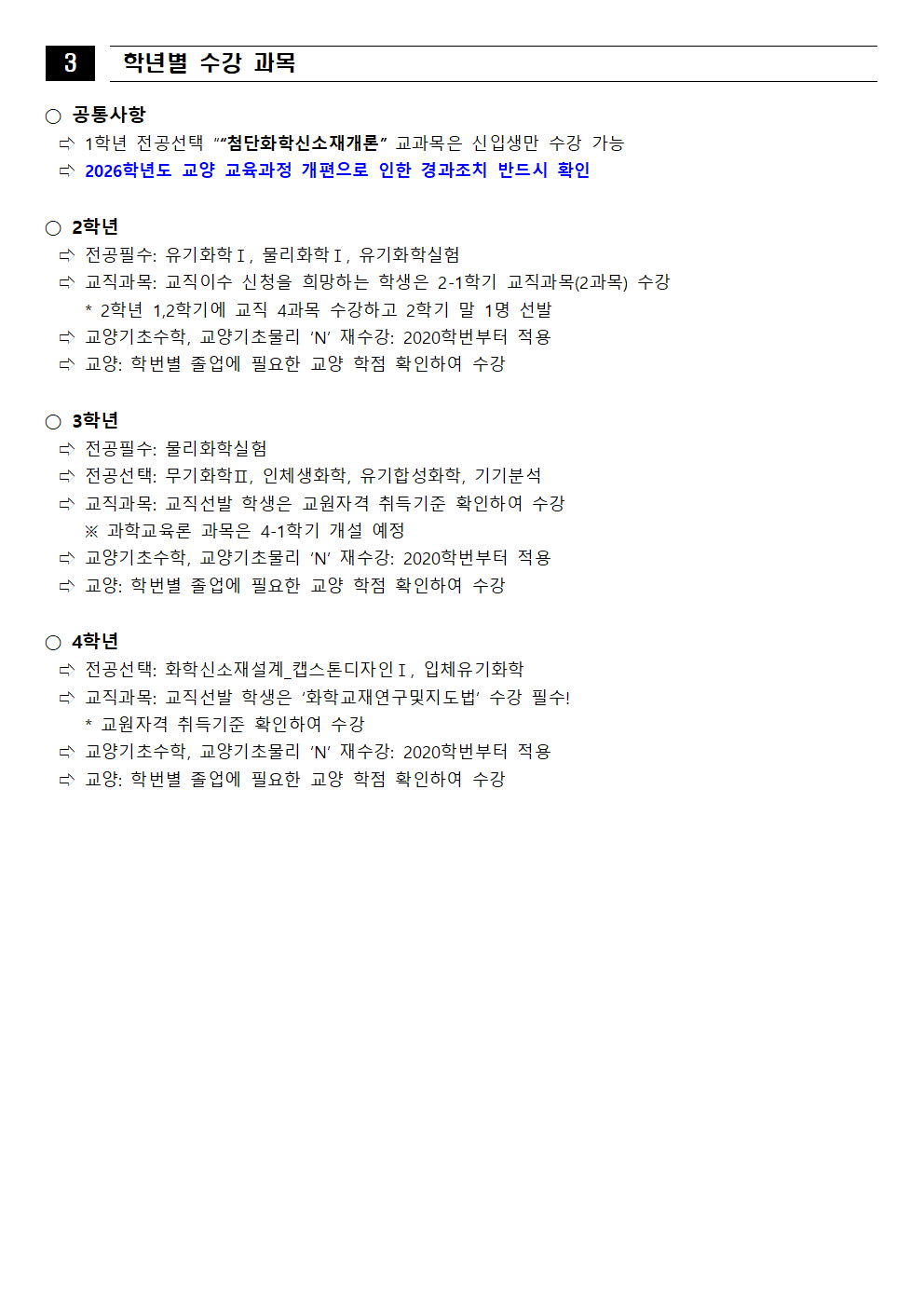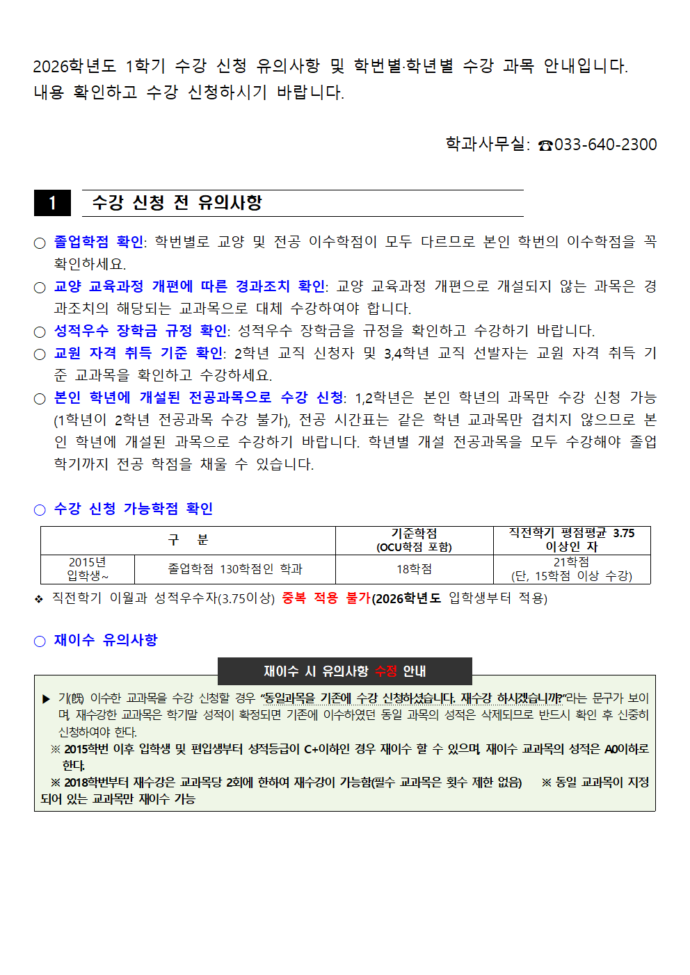 fnctId=bbs,fnctNo=562 [학부] 2026학년도 1학기 학년별 수강학신청 안내 작성일 2026.02.18 작성자 진미영 조회수 511 첨부파일 1. (2020~2025학번) 교육과정 이수기준표.pdf 4. 장학금 규정(학과).pdf 3. (2019~2024학번) 강릉원주대학교 비교과 활동 졸업인증 운영 규정.hwp 0. 2026학년도 1학기 교육과정 수강편람(최종).pdf 2. (교직이수자) 교원자격 무시험검정 합격기준.pdf