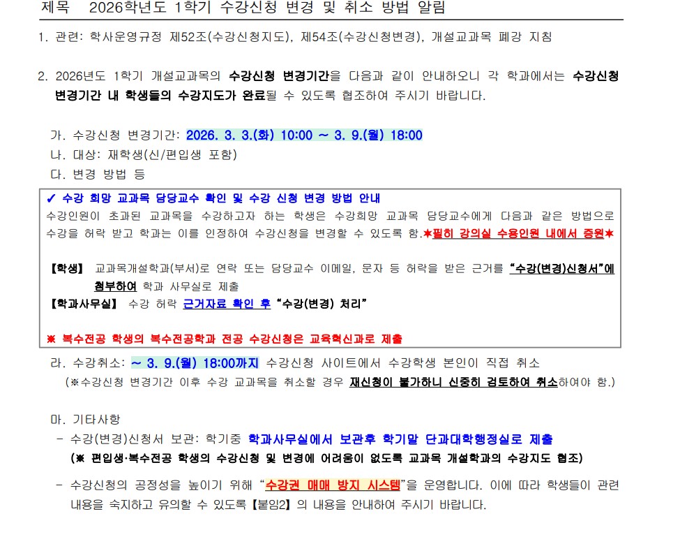 fnctId=bbs,fnctNo=642 2026학년도 1학기 수강신청 변경 및 취소 방법 알림 작성일 2026.02.26 작성자 노종민 조회수 370 첨부파일 2026학년도 1학기 수강권 매매 방지 시스템 운영 안내(수강신청 변경기간).hwp 수강신청 변경 신청서(2026).hwp