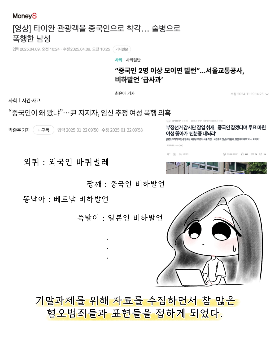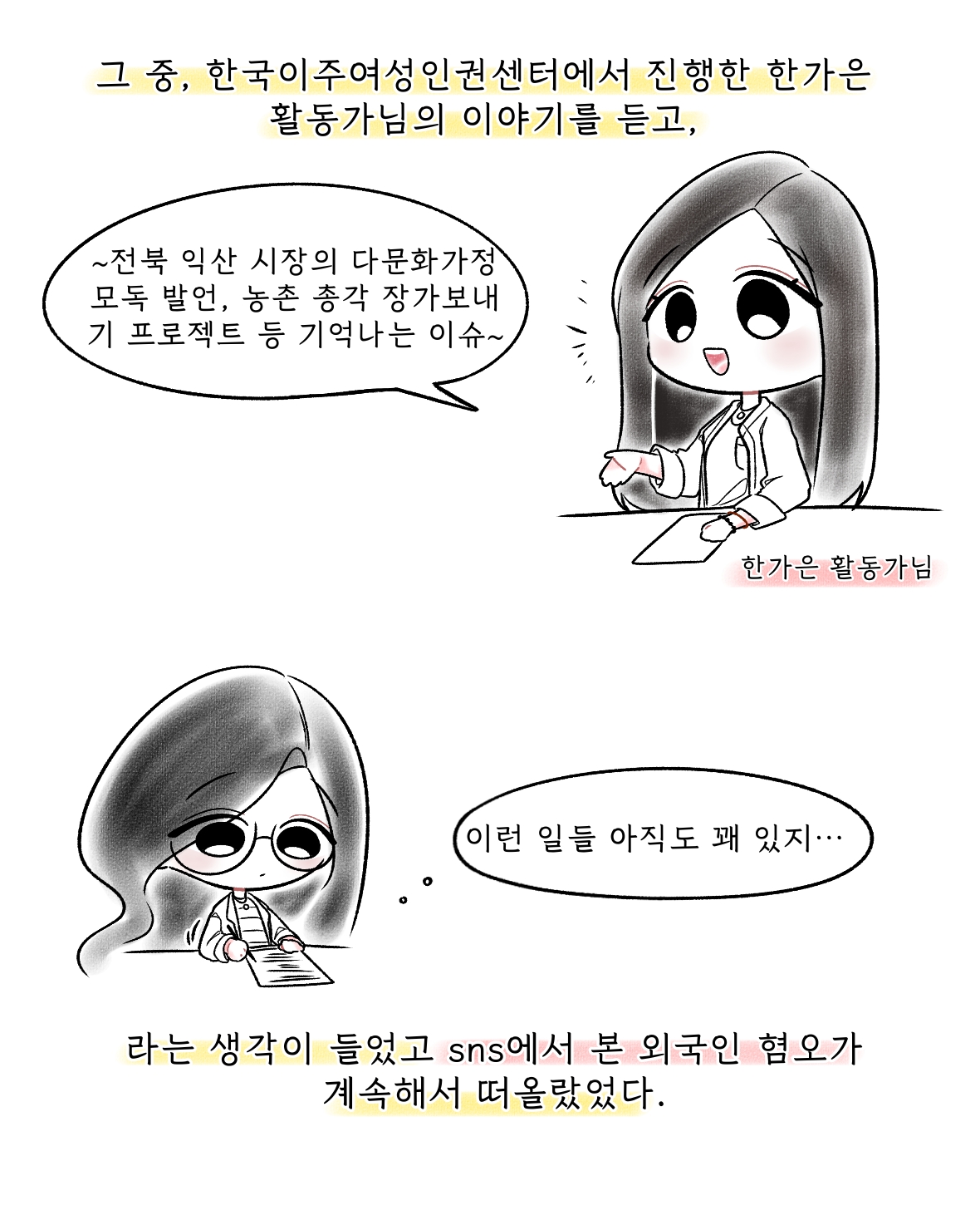 fnctId=bbs,fnctNo=864 2025-1 이민다문화현장세미나_캡스톤디자인(우효주) 작성일 2025.06.20 작성자 김민정 조회수 1907 *2025년 1학기 전공선택 과목으로 개설된 <이민다문화현장세미나> 수업의 결과물입니다! 제노포비아에 대해 인스타툰으로 그려보았습니다 :) 첨부파일 첨부파일이(가) 없습니다.