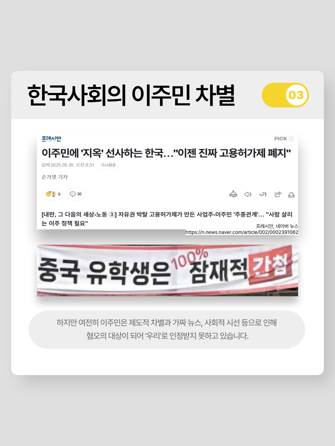 강의내용과, 활동가 인터뷰, 강연을 바탕으로 이주민과 공존하는 방법에 대한 카드뉴스를 제작하였습니다