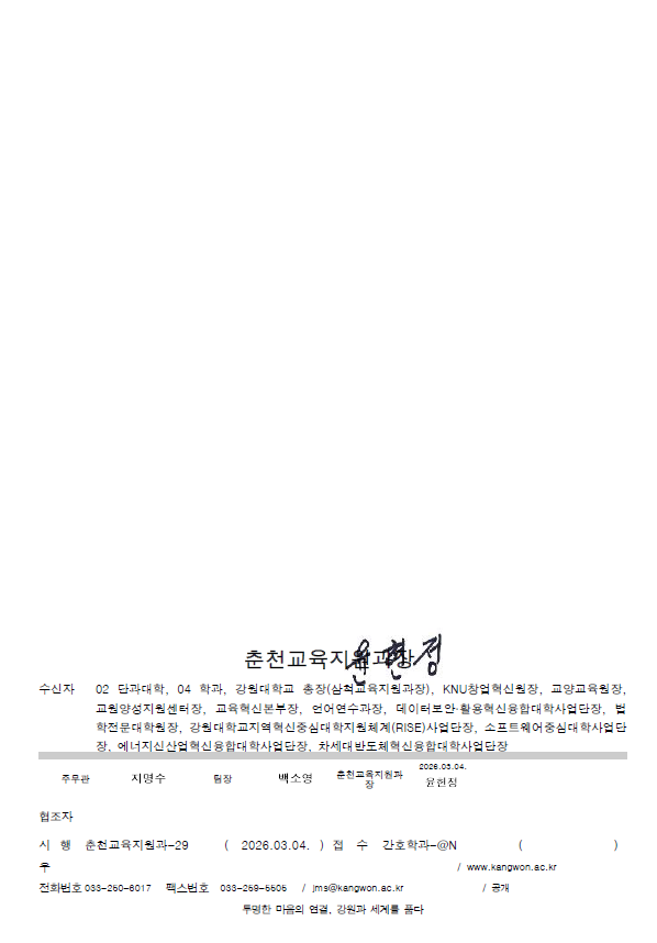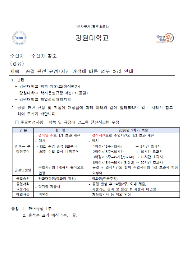 fnctId=bbs,fnctNo=840 공결 관련 규정 및 지침 개정에 따른 공결 제출 절차 안내(서식 포함) 사항입니다. 작성일 2026.03.04 작성자 원민정 조회수 169 공결 관련 규정 및 지침 개정에 따른 공결 제출 절차 안내(서식 포함) 사항입니다. 주요변경사항 확인 바랍니다. 첨부파일 공결 관련 규정_지침 개정에 따른 업무 처리 안내.pdf 1.공결관련규정.hwp 출석부표기예시.hwp