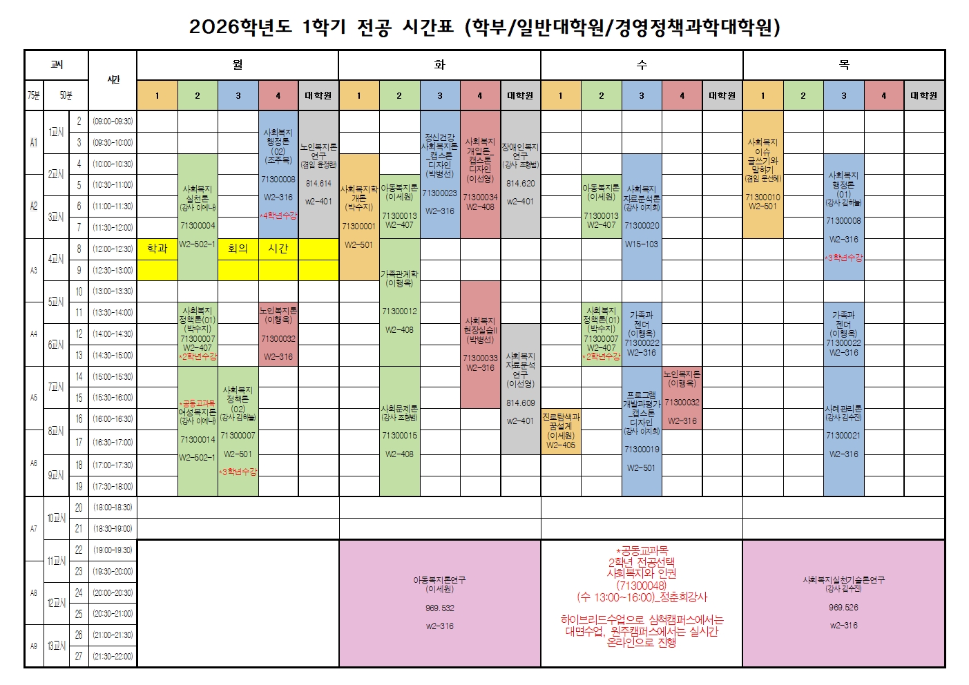 ※ 2026학년도 교육과정 개편으로 사회복지정책론, 사회복지행정론은 학년별 분반이 나눠져 있으므로 반드시 해당 학년분반으로 수강신청해야 함.